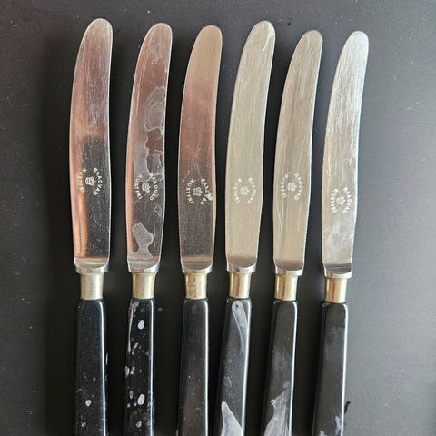 12 stk Raadvad smørkniv med skaft i brun farve og blad i rustfrit stål. Kniven er 12 cm lang og egnet til smøring af brød og lignende. Designet til daglig brug.