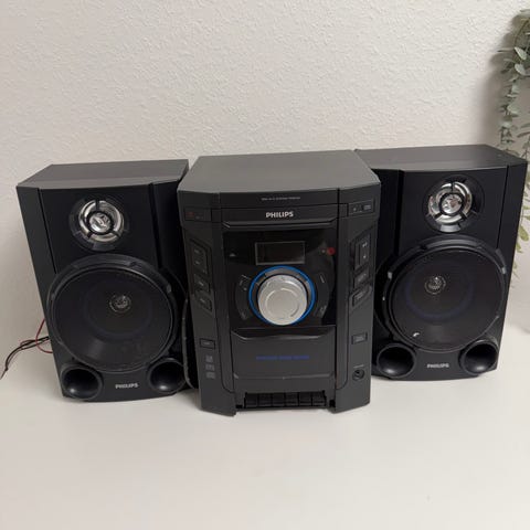 Philips stereopakker bestående af flere små højttalere, tilslutningskabler og en subwoofer. Systemet er designet til at levere lyd til hjemmeunderholdning og kan forbindes til kompatible lydkilder. Farve: grå/sølv. Materiale: plast og metal.