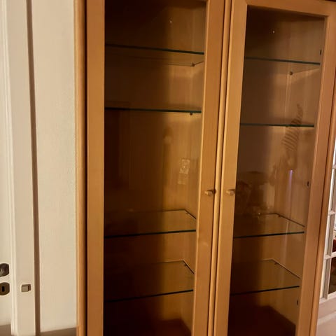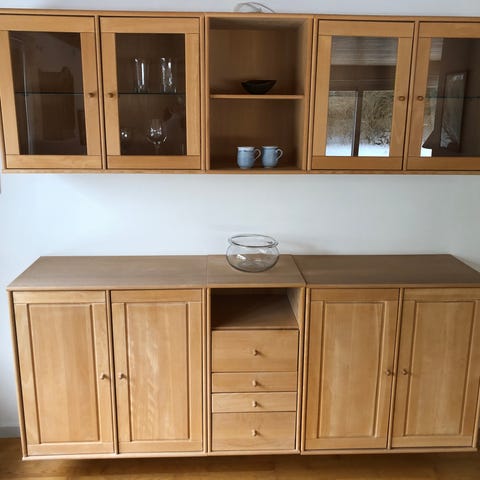 Arkitekttegnet væghængt overskab i lakeret bøg af mærket Rebus, fremstillet af Vantinge Møbelindustri. Med glaslåger og glashylder. Fremstår som nyt uden brugsspor. Bredde 78 cm, højde 59,5 cm, dybde 28 cm.