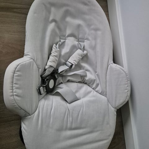Stokke børnelænestol med gråt polstret betræk. Materialet er let at rengøre og egnet til daglig brug. Brugt til et barn i 6 mdr.