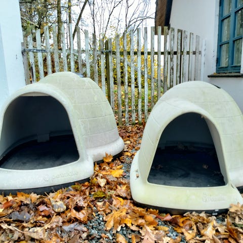 Hundeiglo hundehus i beige farve med mønster. Indeholder en blød, grå pude for komfort. Velegnet som sovested til små til mellemstore hunde.