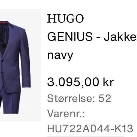 Hugo Boss herretøj i størrelse 46, blå / Navy. Inkluderer bukser og jakke med tilhørende opbevaringspose. Materialet fremgår af vaskeanvisningen, egnet til formelle lejligheder eller professionel brug. Brugt 1 gang. Kvittering haves. Længde bukser 103 cm. Modellen er 185 cm høj nu. Han var ca 15-20 cm lavere, da vi købte det.