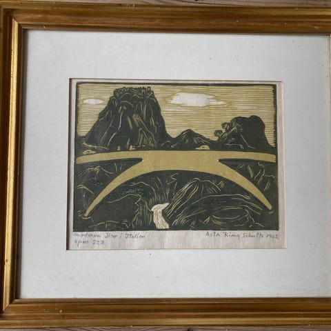 Asta Ring træsnit kunstværk fra 1918, der viser en gade med en gadelygte og huse. Værket er indrammet i en træramme med glas. Signeret og dateret af kunstneren. Farverne er afdæmpede med nuancer af sort, grå og grøn.