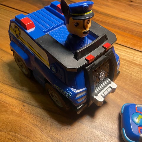 Paw Patrol Chase fjernstyret legetøjsbil i blå farve. Bilen er lavet af plastik og inkluderer en fjernbetjening til styring. Designet med karakteren Chase fra Paw Patrol-serien. Egnet til børn.