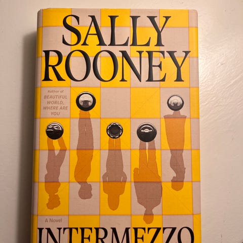 Sally Rooney Intermezzo bog med gul og hvid ternet omslag. Bogen er i paperback-format. Bogen er helt ny og stadig i sin plastik. Bogen er på engelsk.