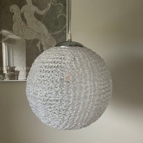 IKEA pendel lampe lavet af flettet naturmateriale med et rundt design. Lampen er designet til ophæng og passer til forskellige indendørs rum. Den har en neutral farve, der fremhæver det naturlige materiale og giver et varmt lys.