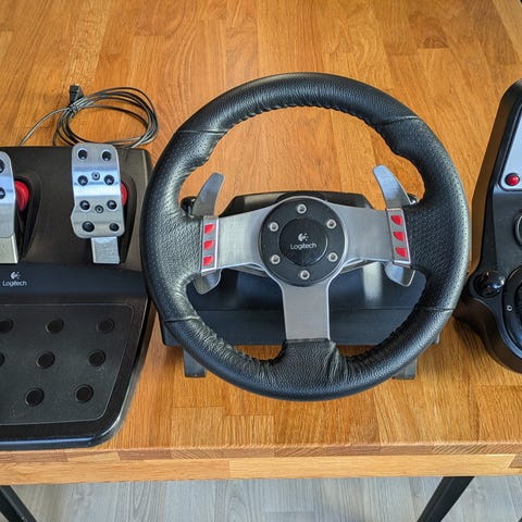 Logitech G27 Racing Wheel Controller med tilhørende pedaler. Udstyret med flere knapper og drejeknapper til justering under kørsel. Designet til brug med computerspil, især racingspil. Fremstillet i sort materiale med rød drejeknap. Inkluderer rat og pedal-sæt for en komplet køreoplevelse.