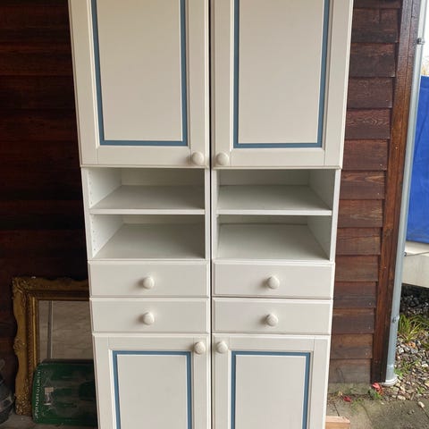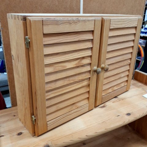 Fint gammelt skab til badeværelset med en lille hylde til venstre og to hylder i højre side