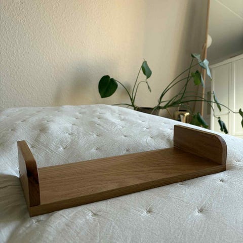 Lille åben egetræfiner hylde til vægophæng. Uden bagvæg. Ubrugt med original klistermærke på. Fra Søstrene Grene. Natbord eller børnehøjde