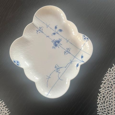 To tallerkener og en lille kop i stellet Blå Palmet fra perioden 1985-1991.