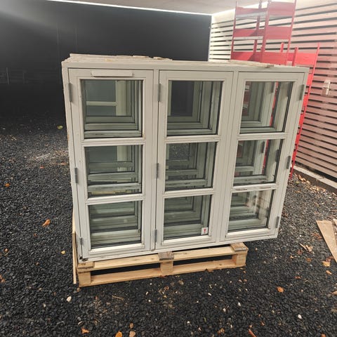 Sæt af brugte hvide vinduer i træ i forskellige størrelser og designs. Vinduerne har enkelt- eller dobbeltruder og er velegnede til renoveringsprojekter eller udskiftning i eksisterende bygninger. Materialet er træ med glas, og vinduerne har forskellige åbningstyper. Vinduerne er ikke nye og kan have tegn på brug. Har også forskellige vinduer uden kam.