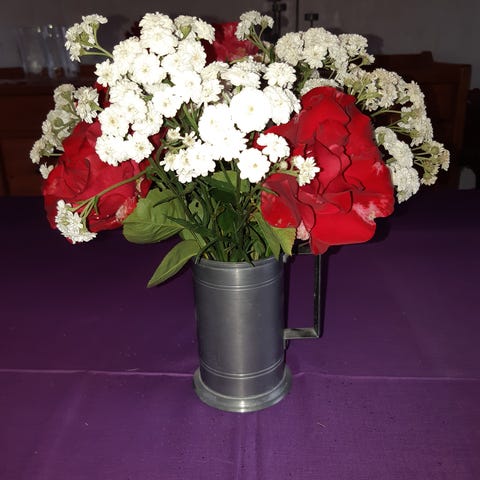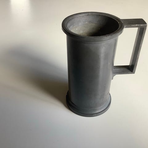 Smukt gammelt fransk tinkrus / vase i tin. Med stempel. Måler en liter. Perfekt til roserne fra haven. H: 18,5 cm.