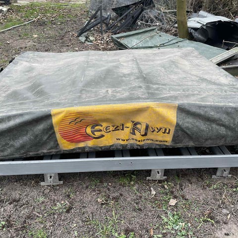 Teltstængerne til regnslaget er blevet bøjet, grundet den snævre plads ved markisen.