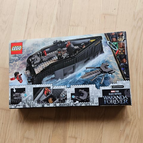 LEGO Marvel Black Panther Wakanda Forever Legetøjssæt med flere figurer og interaktive elementer. Sættet indeholder en trone, køretøj og diverse tilbehør, designet til at genskabe scener fra Black Panther Wakanda Forever filmen.