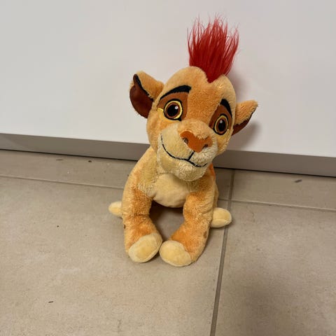 Disney Løvenes Konge Simba bamse i blødt materiale. Bamsen er gul med lyse og mørke detaljer, velegnet til børn.
