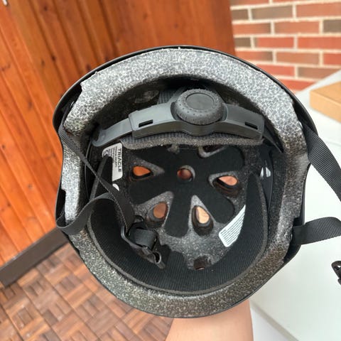 Scoot and Ride hjelm i størrelse XXS-S, passer hovedomkreds 45-51 cm (17.7-20 tommer). Hjelmen er grå med mønster. Lygten trænger til nyt batteri.