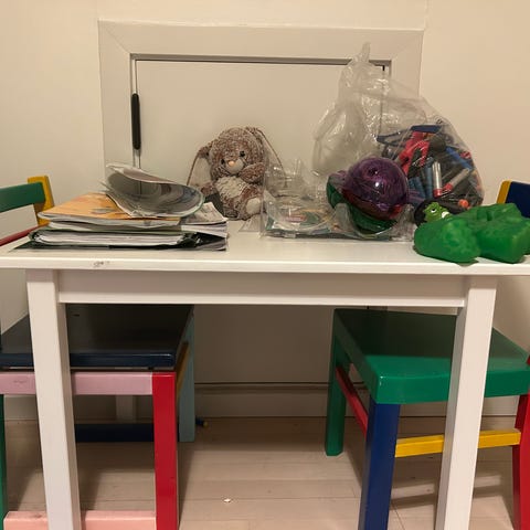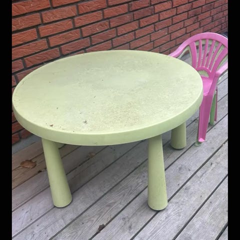 Et hjemmelavet børnebord/bænk, der fulgte med huset. Passer til 1-4 årige børn.