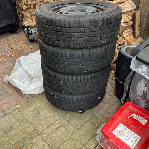 4 stk stålfælge med Continental vinterdæk. 2 stk har ca. 2mm mønster, 2 trænger til at blive skiftet. 4 stk hjulkapsler medfølger.