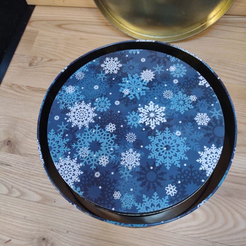2 stk, runde, den store måler 17,5 cm, den mindre måler 15x 13 cm, sødt motiv med juletræer og Klarborg nisse. Super fin stand. Sælges samlet. Sender gerne, dog ikke med fiks færdig, porto oveni