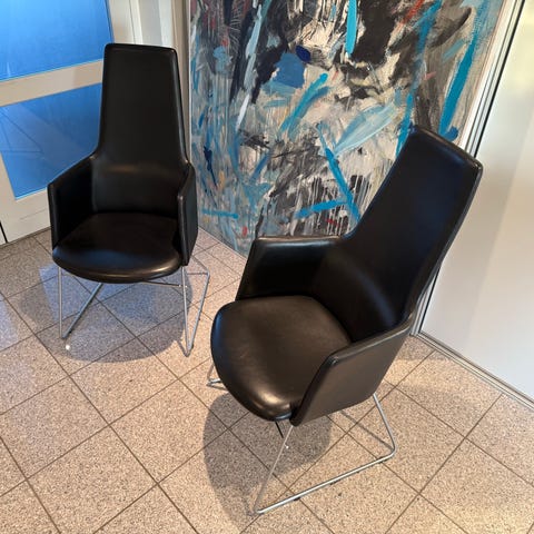 NIELS GAMMELGAARD stol „Suite" produceret hos bent Krog. Designet i 1996, forkromet stål, lamineret træ og lysebrunt læder.