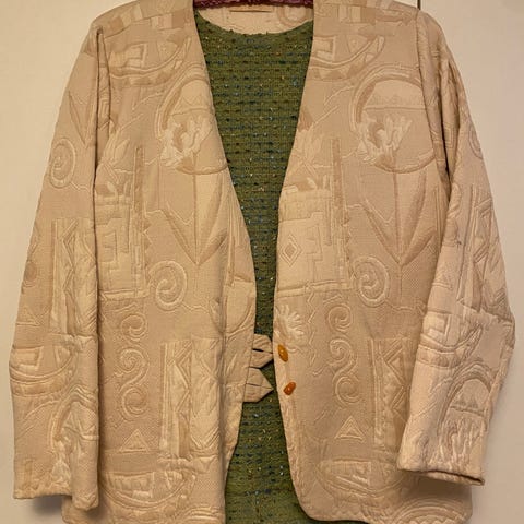 Faconsyet jakke med lynlås og skjulte lommer, ca str 40. Håndvævet og håndsyet i uld og silke af den bornholmske tekstildesigner Bente Hammer. Meget lidt brugt. Afhentes i Lyngby eller sendes evt for 50 kr ekstra.