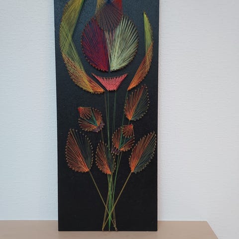 Smukt vintage billed; farvede tråde, fastgjort med stifter. Str 27 x 65 cm