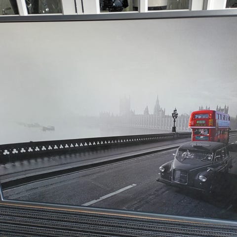 Flot stort billede med LONDON i egetræsramme klar til ophæng.