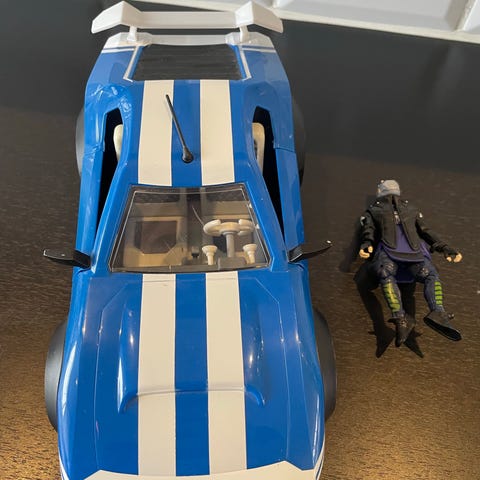 Fortnite Legetøj Golfvogn i blå og hvid med tilhørende figurer og tilbehør. Sættet inkluderer en golfvogn, to figurer, en golfkølle og andet småtilbehør. Materialet er plast, og produktet er designet til børn.