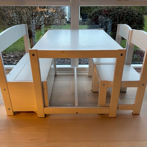 Sælger et sødt lille IKEA børnebord med to matchende, farverige stole. Perfekt til leg, tegning, lektier eller kreative projekter!