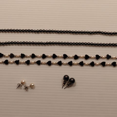 Fin perlekæde med blanke blodsten, 43 cm, sidder tæt rundt i halsen, 75 kr.