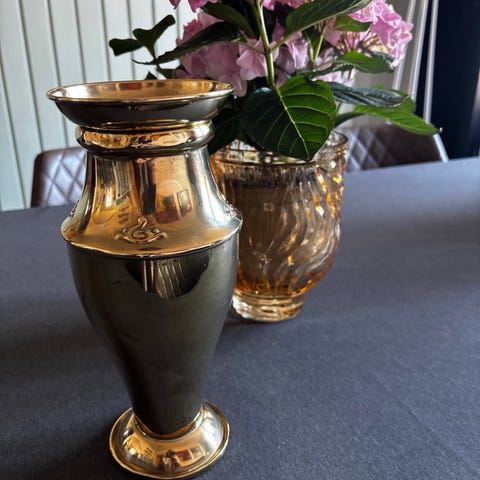 En stor gammel messing vase , med blomster mønster, har den original vand beholder , er ikke blevet pudset, højde 33 cm . SENDER KUN MED DAO ELLER AFHENTNING .
