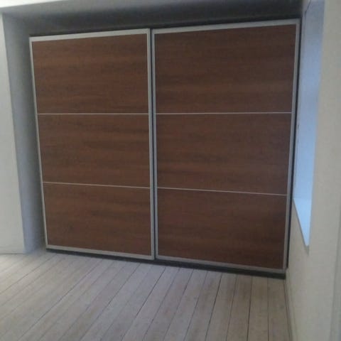 Skydedørsskab som kan bruges til indbygning eller op af væg. Med spejl låger. Væg som bagbeklædning. 1 bøjlestang og 2 flytbare hylder i hver skab.