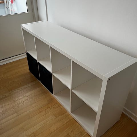 IKEA Kallax reol med 4 rum i sort farve. Reolen er lavet af træmateriale og har en enkel, firkantet opbygning. Velegnet til opbevaring af bøger, dekorationer eller andre genstande i hjemmet eller kontoret.