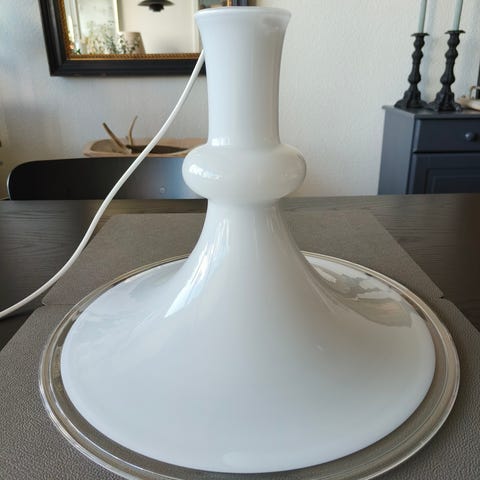 Smuk HOLMEGAARD ETUDE Loftslampe/pendel. Diameteren er 39,2 cm, højde 29 cm. Lampen er i hvid opal glas og med en 2 cm klar glas i yderkanten. Rigtig flot stand.