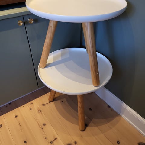 De er brugte og det ene har lidt mere slid på kanterne men er ellers i fin stand. Træet på benene er super fint.