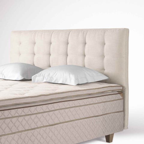 DUX kontinentalseng med gråt betræk i stofmateriale. Sengen har en robust konstruktion med polstret topmadras og ben i træ. Velegnet til soveværelser og tilbyder støtte og komfort.