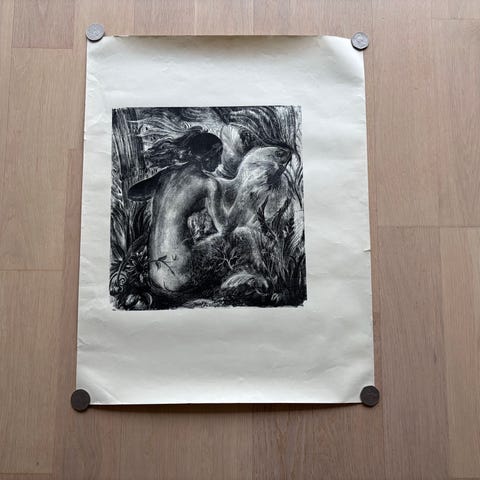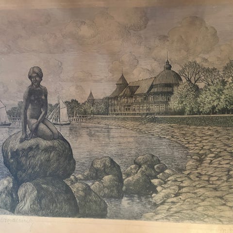 Gammel plakat, tryk fra Just A med havfrue og fisk motiv.