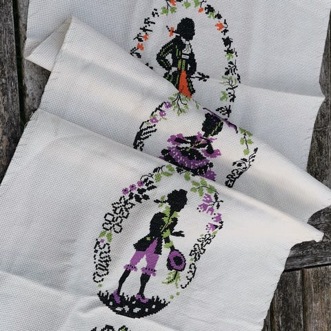 Vtg. Korssting mønster til broderi af romantiske par i strut kjoler og knæbukser. 80s.