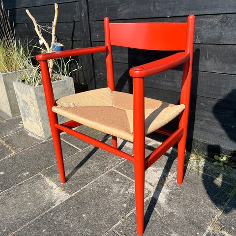 CH36 wegner stol. Den er restaureret. Omlakeret og nyt flet på. Desværre er mærket derfor væk, men man kan stadig se trykket (se billede) der viser dens ægthed.