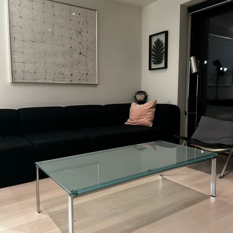 1 stk brugt glas sofabord designet af Ludvig Mies Van der Rohe model Coffee table fra serien Mr Table. Der er ikke præget logo eller signatur i stellet. Bordet er i rigtig god stand med alm brugsspor. Ø:71,5cm. H:52,5cm. Glasplade 12mm. Bordet er ikke nyt og sælges derfor som brugt, derfor kan der forekomme ridser, slid og skrammer. Prisen for bordet er kun 3.500kr.