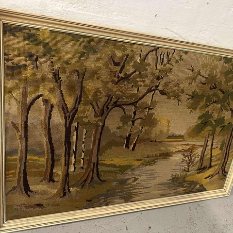 Flot håndbroderet billed af bonsai. Måler h 42,5 cm b 32,5 cm sælges for kr. 200,-