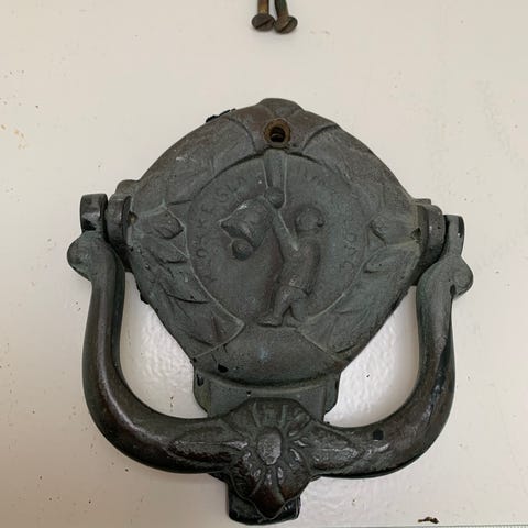 Gammel dørhammer i messing, med påskriften “klokkeslag ringer dag”