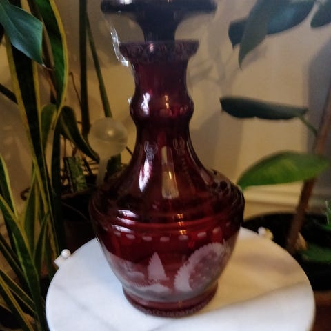 Glas jule karaffel med kristorn og sølvprop. H 20 cm b 10 cm d 8 cm kr. 70,-