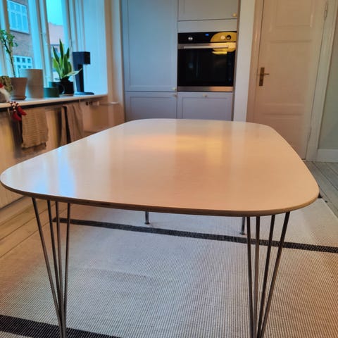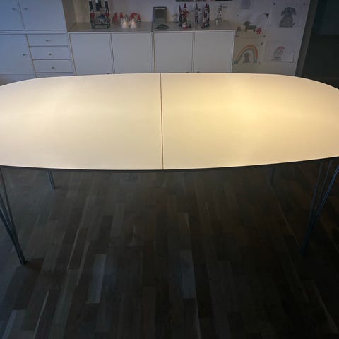 Særdels solidt og stabilt bord, IKEA GRIMLE. Bordpladen er hvid melamin. Sættet inkluderer metalben som kan afmonteres. Velegnet til brug som spisebord eller arbejdsbord.