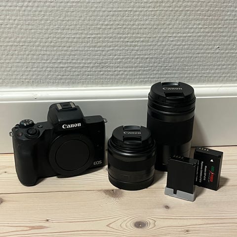 Canon M5 spejlløst kamera med 18-150mm optik, 11-22mm optik + flere batterier.