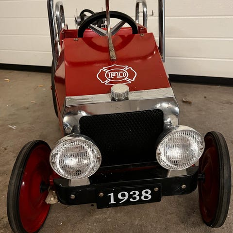 Brandbil i metal med pedaler. Pedaler kan justeres i 3 længder.