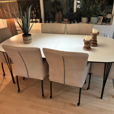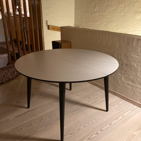 Spisebord med bordplade i hvid laminat og sortbejset ben i eg.