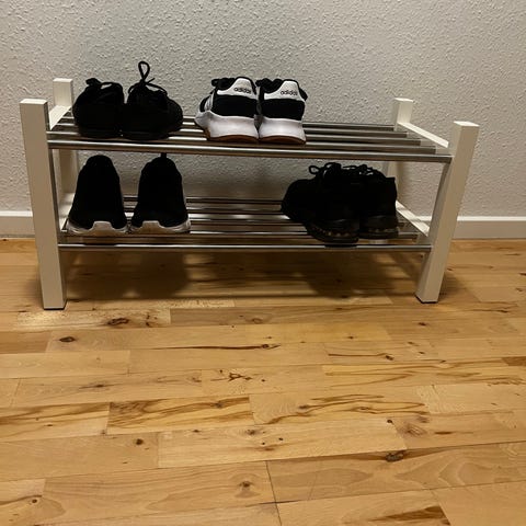 16 cm mellem hver hylde, så kan rumme sko og støvletter.