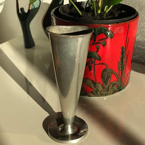 Super smuk og meget tung tinvase af Just Andersen. Fremstår flot blankpoleret, men med aldersvarende sort patina nogle steder samt alderssvarende overfladebrugsspor.