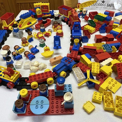 Flere Biler , togvogne , skinner, personer og masser af klodser